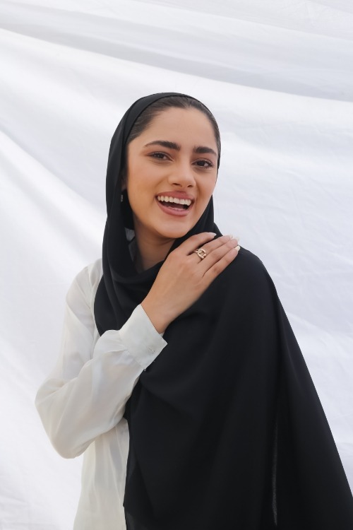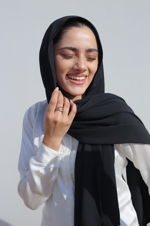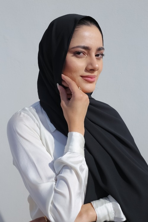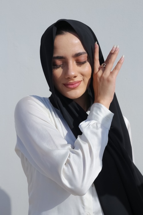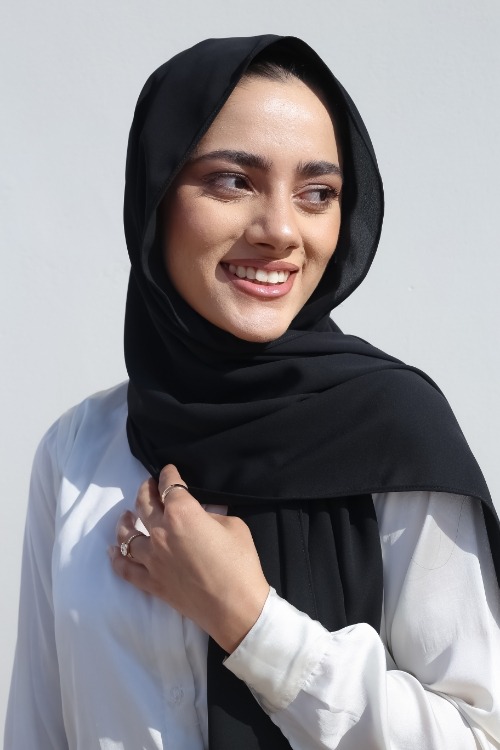 Your go to; our fan favourite! Get your hands on our versatile and refined georgette hijab in shade “JET BLACK”. Whether it’s a formal event or a casual outing, our georgette hijabs promise a chic drape that complement all outfits.